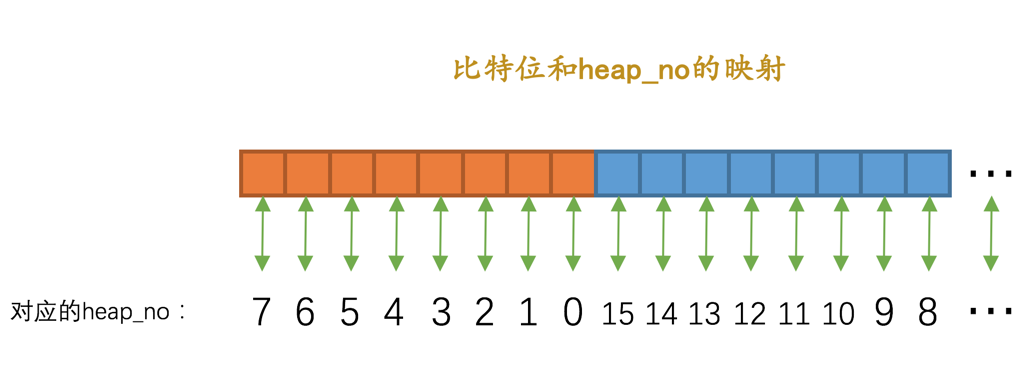 如果是行锁结构的话,在该结构末尾还放置了一堆比特位,比特位的数量是由上边提到的n_bits属性表示的。 我们前边唠叨InnoDB记录结构的时候说过,页面中的每条记录在记录头信息中都包含一个heap_no属性, 伪记录Infimum的heap_no值为0,Supremum的heap_no值为1,之后每插入一条记录,heap_no值就增1。 锁结构最后的一堆比特位就对应着一个页面中的记录,一个比特位映射一个heap_no,不过为了编码方便,映射方式有点怪:
