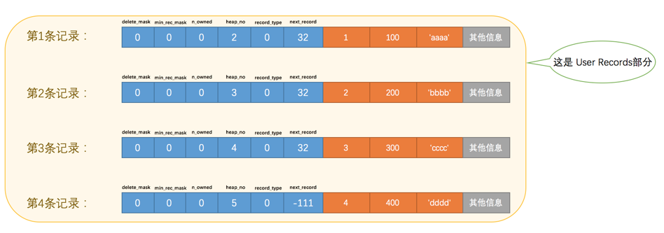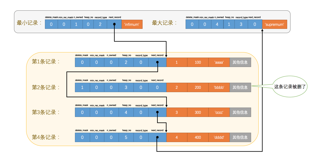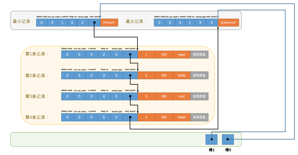 从图中可以看出来,我们的记录按照主键从小到大的顺序形成了一个单链表。最大记录的next_record的值为0,这也就是说最大记录是没有下一条记录了,它是这个单链表中的最后一个节点。