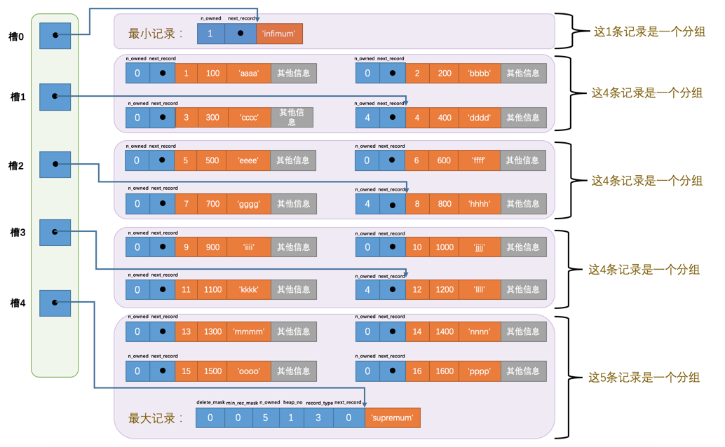 比方说现在的page_demo表中正常的记录共有6条,InnoDB会把它们分成两组,第一组中只有一个最小记录,第二组中是剩余的5条记录
