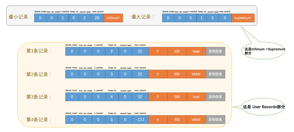 | record_type | 3 | 表示当前记录的类型,0表示普通记录,1表示B+树非叶子节点记录,2表示最小记录,3表示最大记录 |