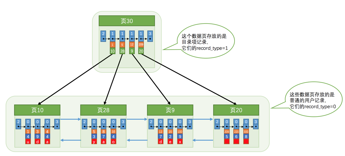 当根节点中的可用空间用完时继续插入记录,此时会将根节点中的所有记录复制到一个新分配的页,比如页a中,然后对这个新页进行页分裂的操作,得到另一个新页,比如页b。这时新插入的记录根据键值(也就是聚簇索引中的主键值,二级索引中对应的索引列的值)的大小就会被分配到页a或者页b中,而根节点便升级为存储目录项记录的页。