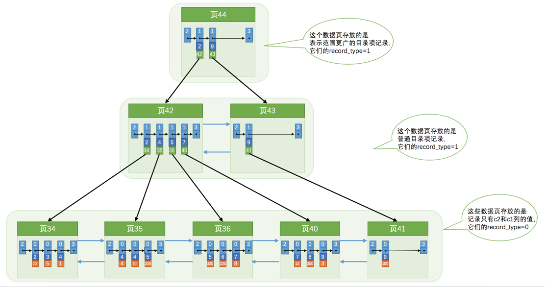 因为这些16KB的页在物理存储上可能并不挨着,所以如果想从这么多页中根据主键值快速定位某些记录所在的页,我们需要给它们做个目录,每个页对应一个目录项,每个目录项包括下边两个部分: