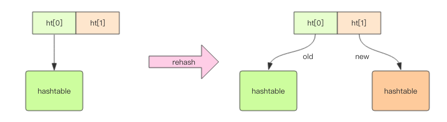 扩容 当hash内部的元素比较拥挤时(hash碰撞比较频繁),就需要进行扩容。扩容需要申请新的两倍大小的数组, 然后将所有的键值对重新分配到新的数组下标对应的链表中(rehash)。 如果hash结构很大,比如有上百万个键值对,那么一次完整rehash的过程就会耗时很长。这对于单线程的Redis里来说有点压力山大。 所以Redis采用了渐进式rehash的方案。它会同时保留两个新旧hash结构,在后续的定时任务以及hash结构的读写指令中将旧结构的元素逐渐迁移到新的结构中。 这样就可以避免因扩容导致的线程卡顿现象。