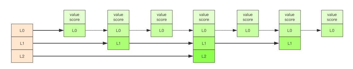 「跳跃列表」之所以「跳跃」,是因为内部的元素可能「身兼数职」,比如上图中间的这个元素,同时处于L0、L1和L2层, 可以快速在不同层次之间进行「跳跃」。
