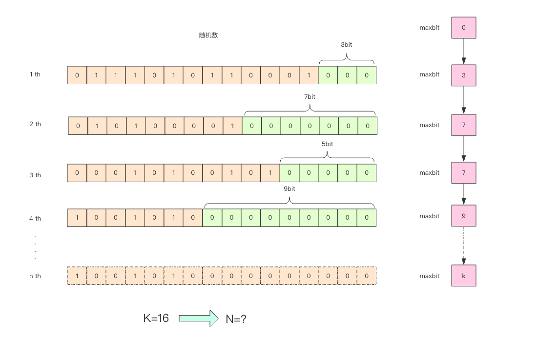 这张图的意思是,给定一系列的随机整数,我们记录下低位连续零位的最大长度 k,通过这个 k 值可以估算出随机数的数量。